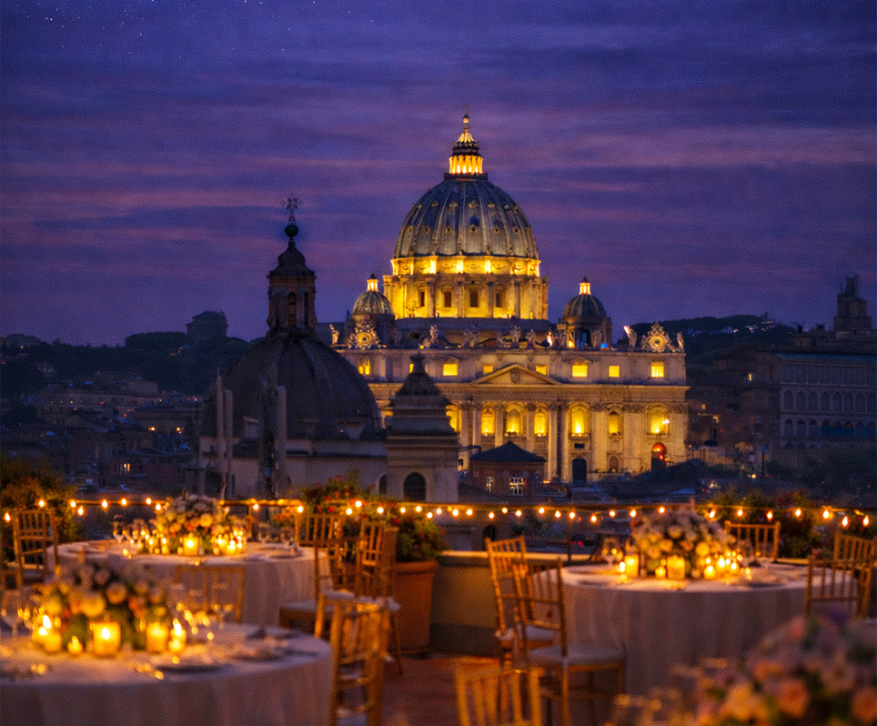 Successivamente saliremo sulla terrazza del Palazzo di Sant’Apollinare per cenare sotto il cielo di Roma, in uno scenario davvero unico.