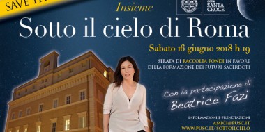 Serata di raccolta fondi sulla terrazza dell'Università (palazzo dell'Apollinare) per offrire borse di studio da destinare a sacerdoti e seminaristi, studenti della nostra Università, provenienti da paesi in condizioni economiche molto disagiate.Lo spettacolo sarà offerto da Beatrice Fazi, attrice di cinena, teatro e TV, che proporrà il monologo “Cinque donne del Sud”. A seguire cena in terrazza.